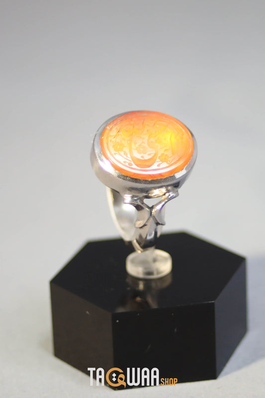 Timeless Men's Silver Ring with Yemeni Orange Aqeeq – Engraved with 'المهدي طاوس اهل الجنة