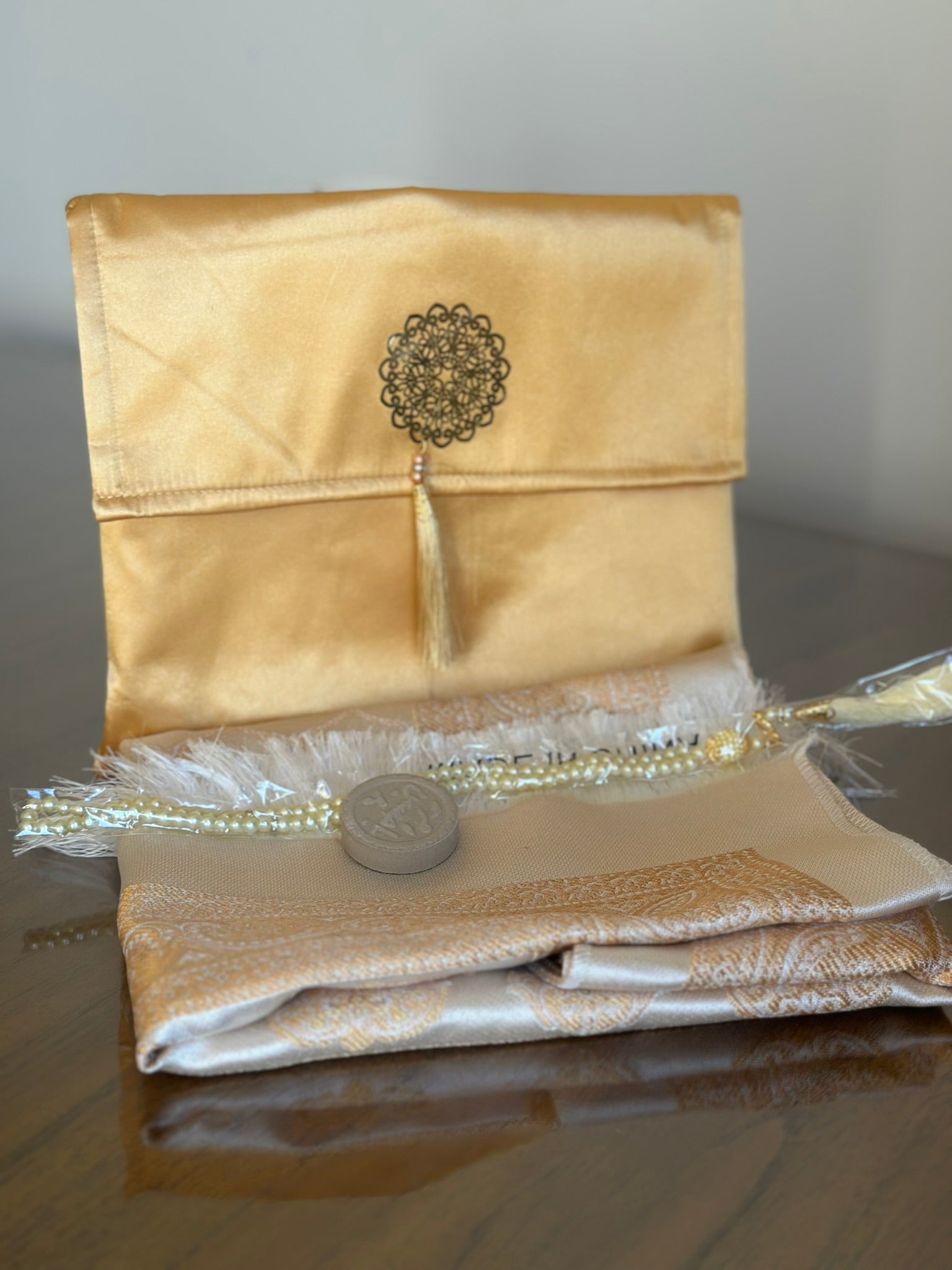 Enhance your prayer experience wherever you go with this beautifully crafted 4-piece Islamic Prayer Set.