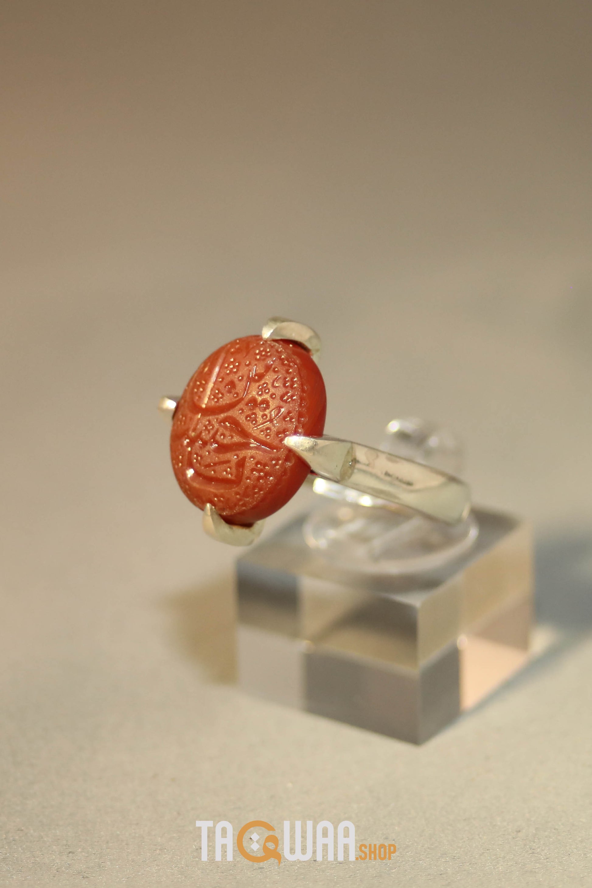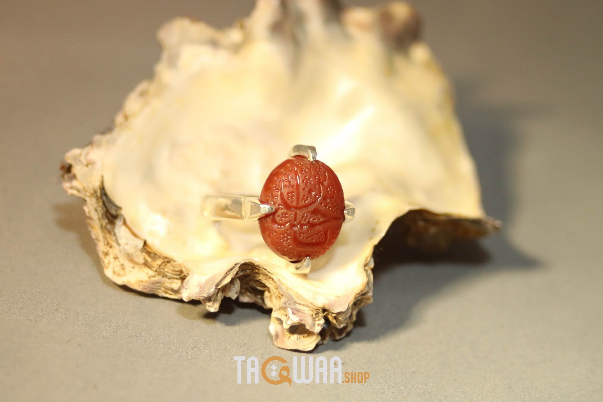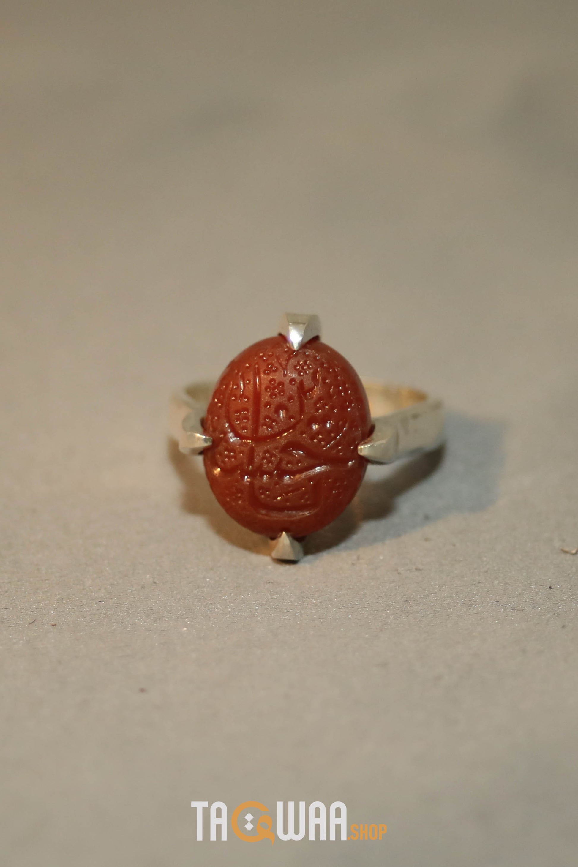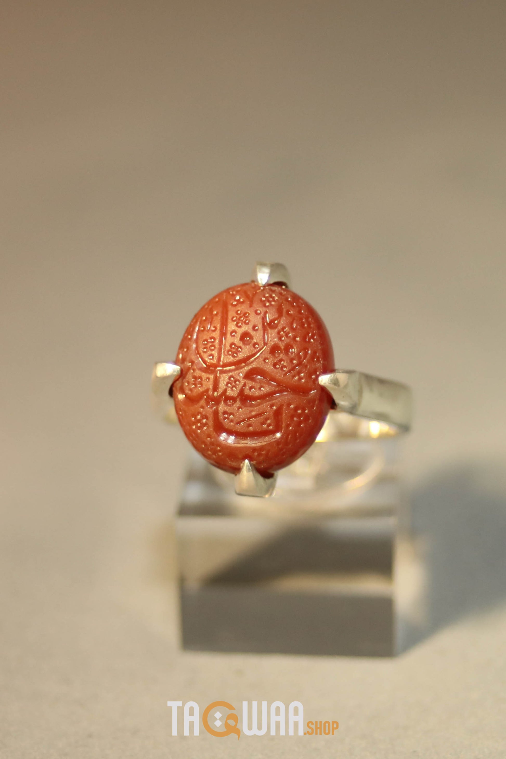 This handcrafted silver ring features a stunning red Yemeni agate and an engraving of 'YA HUSSEIN'. Elegant and rooted in devotion, this ring is the perfect statement piece for those who appreciate fine craftsmanship and hold deep religious beliefs. Show your faith in style with this unique ring.