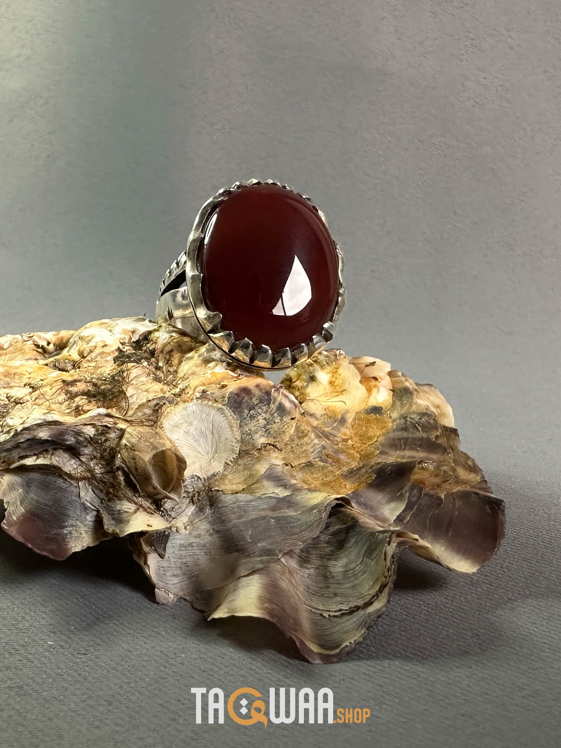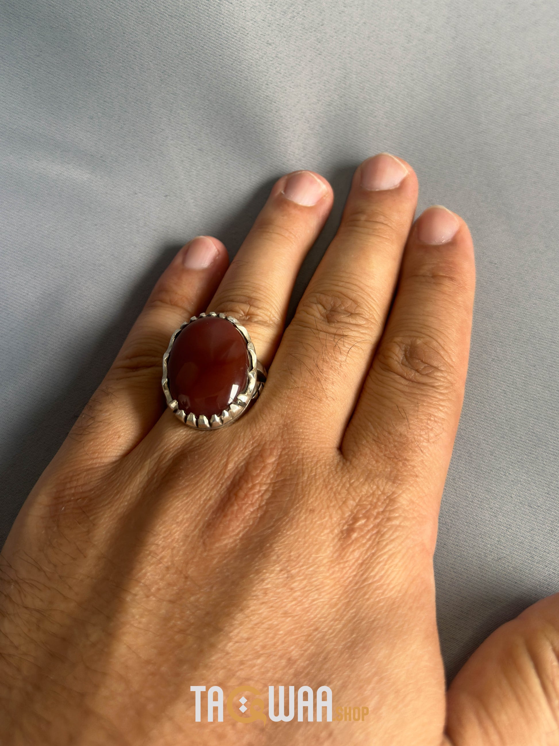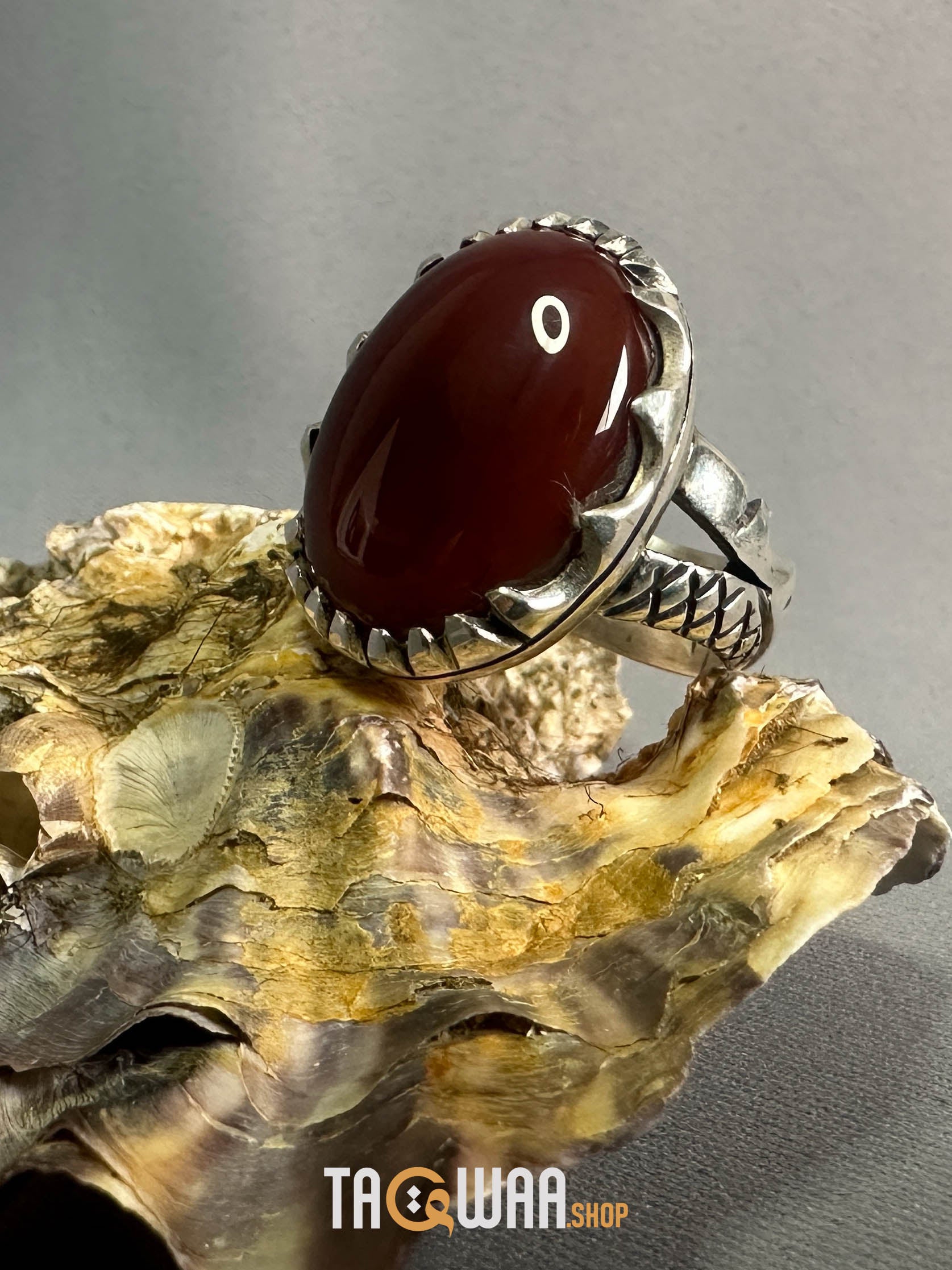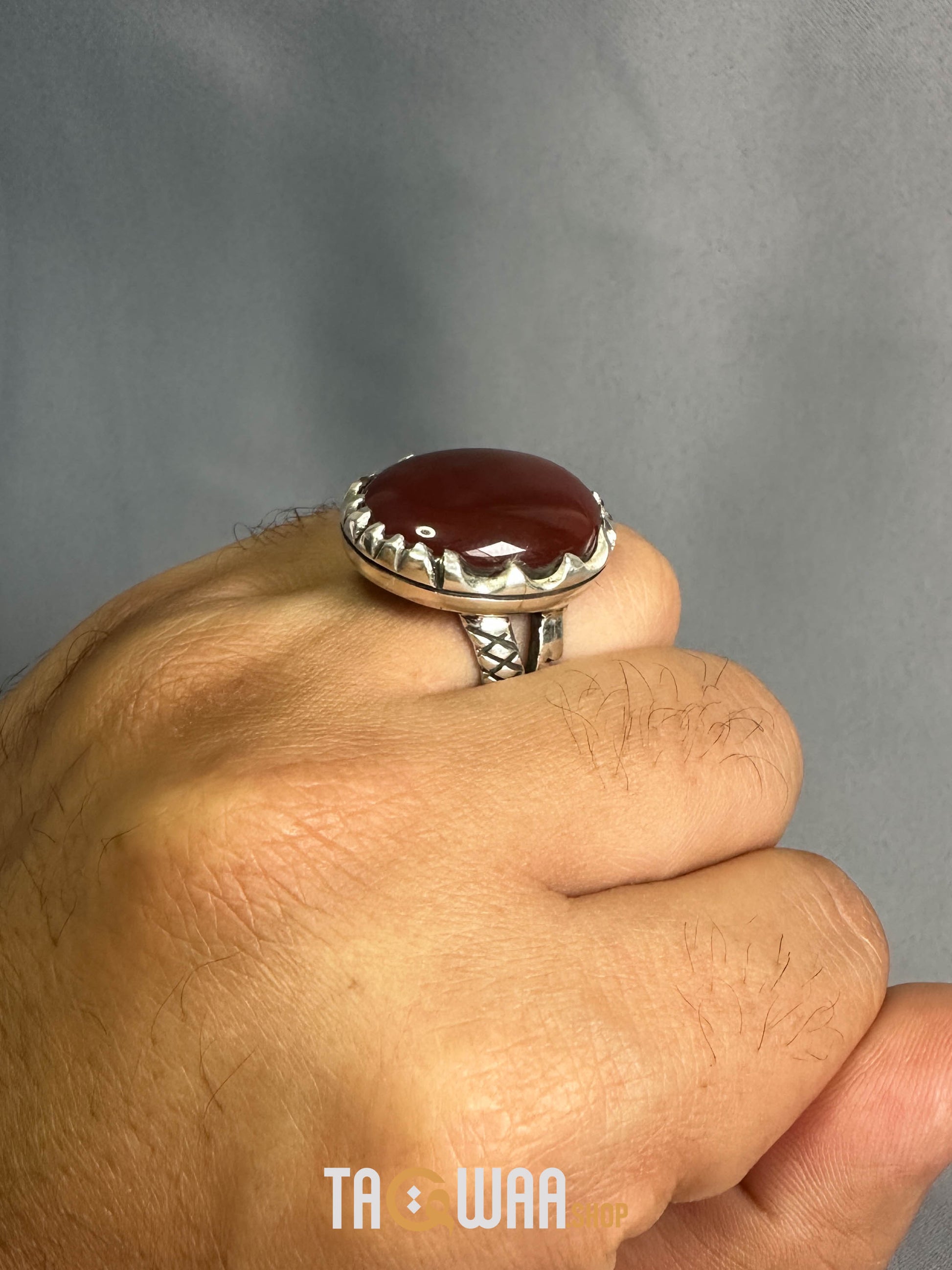 Elevate your style with our Red Yemeni Agate Aqeeq Oval Silver Ring. Handmade with 925 sterling silver and adorned with a red agate-aqeeq stone, its elegant design exudes timeless beauty. Express your individuality with this unique piece. Own a piece of art, crafted with care and precision for you.