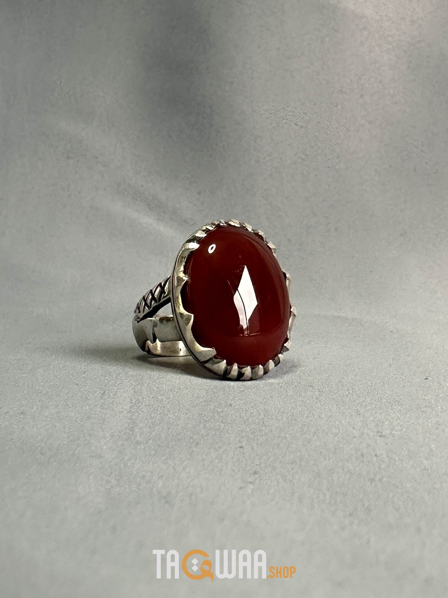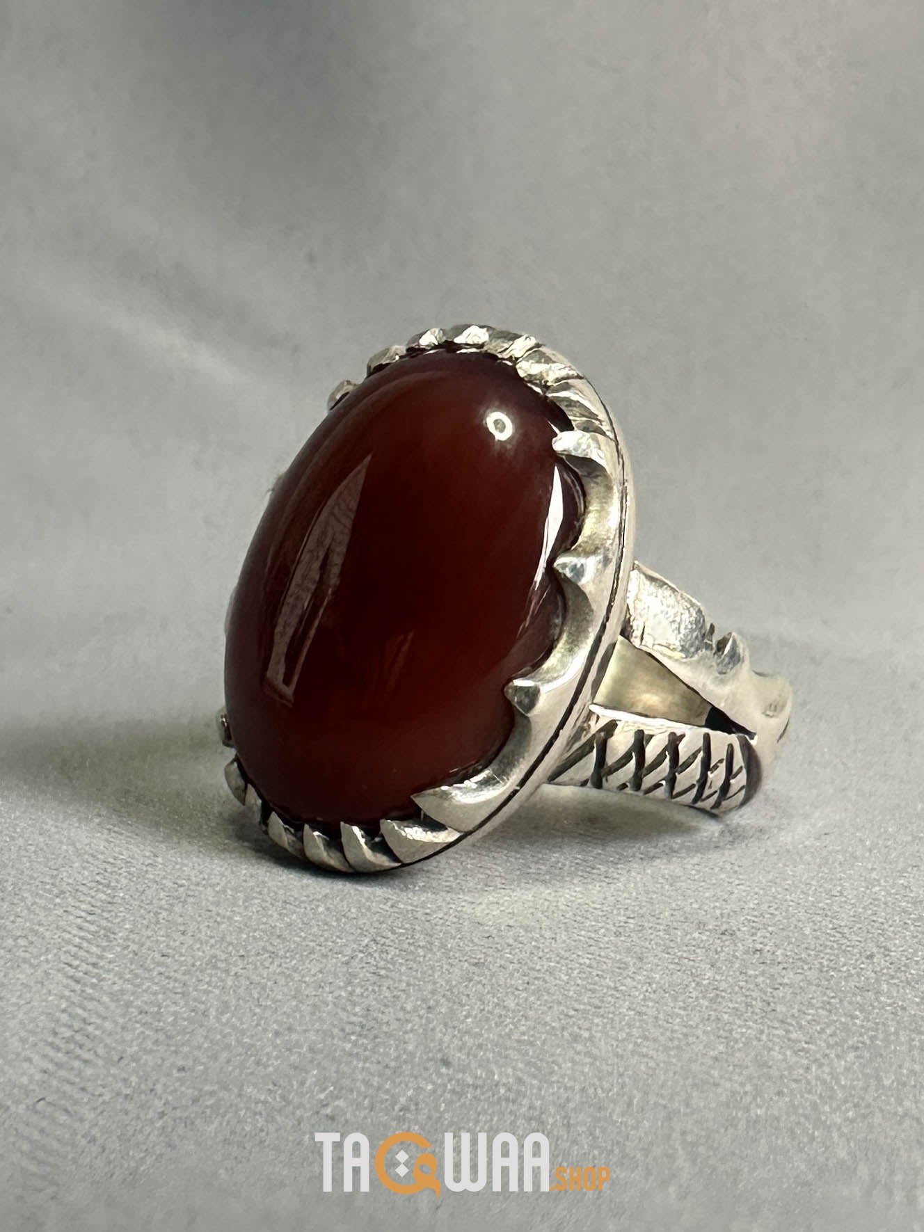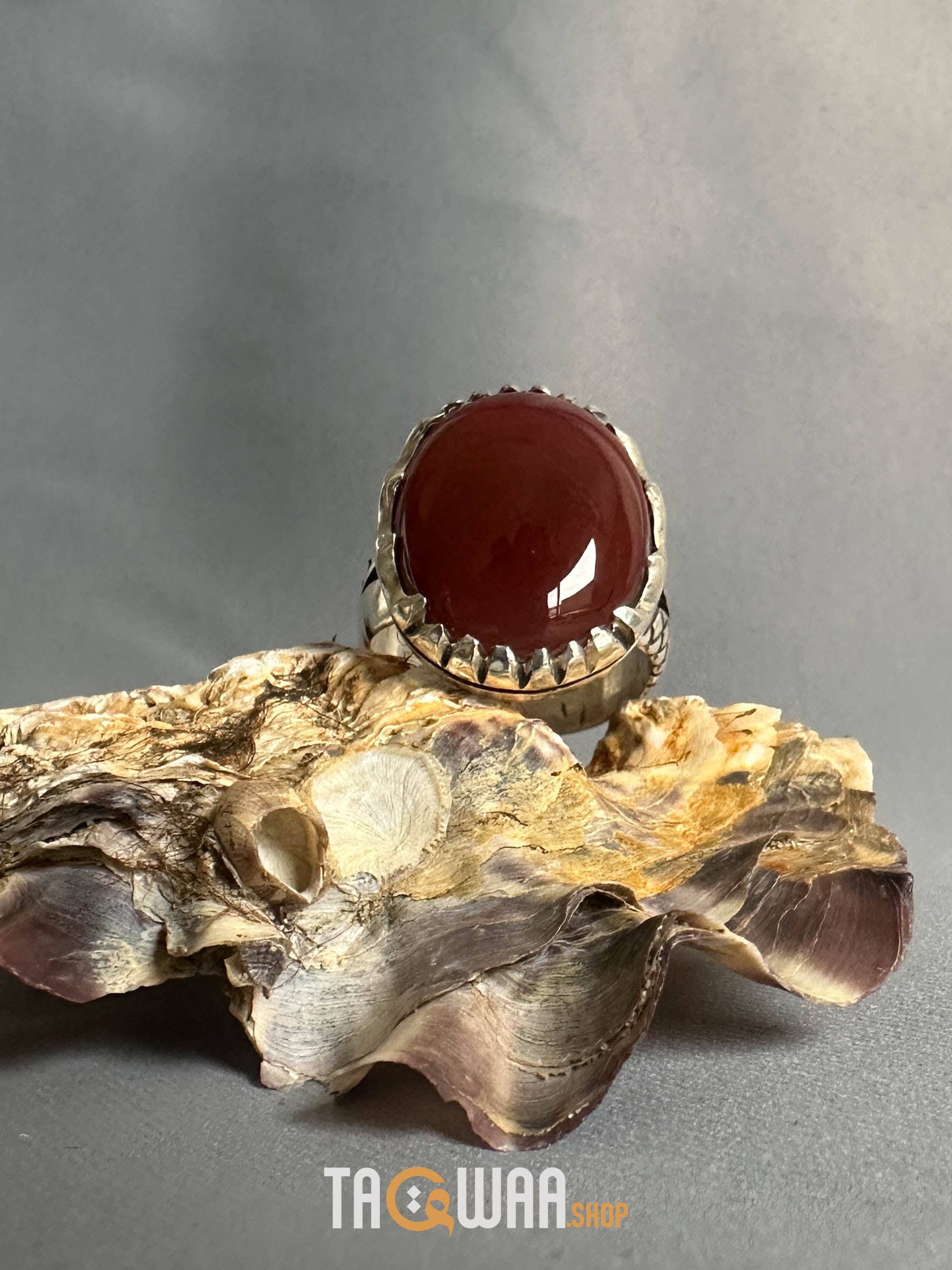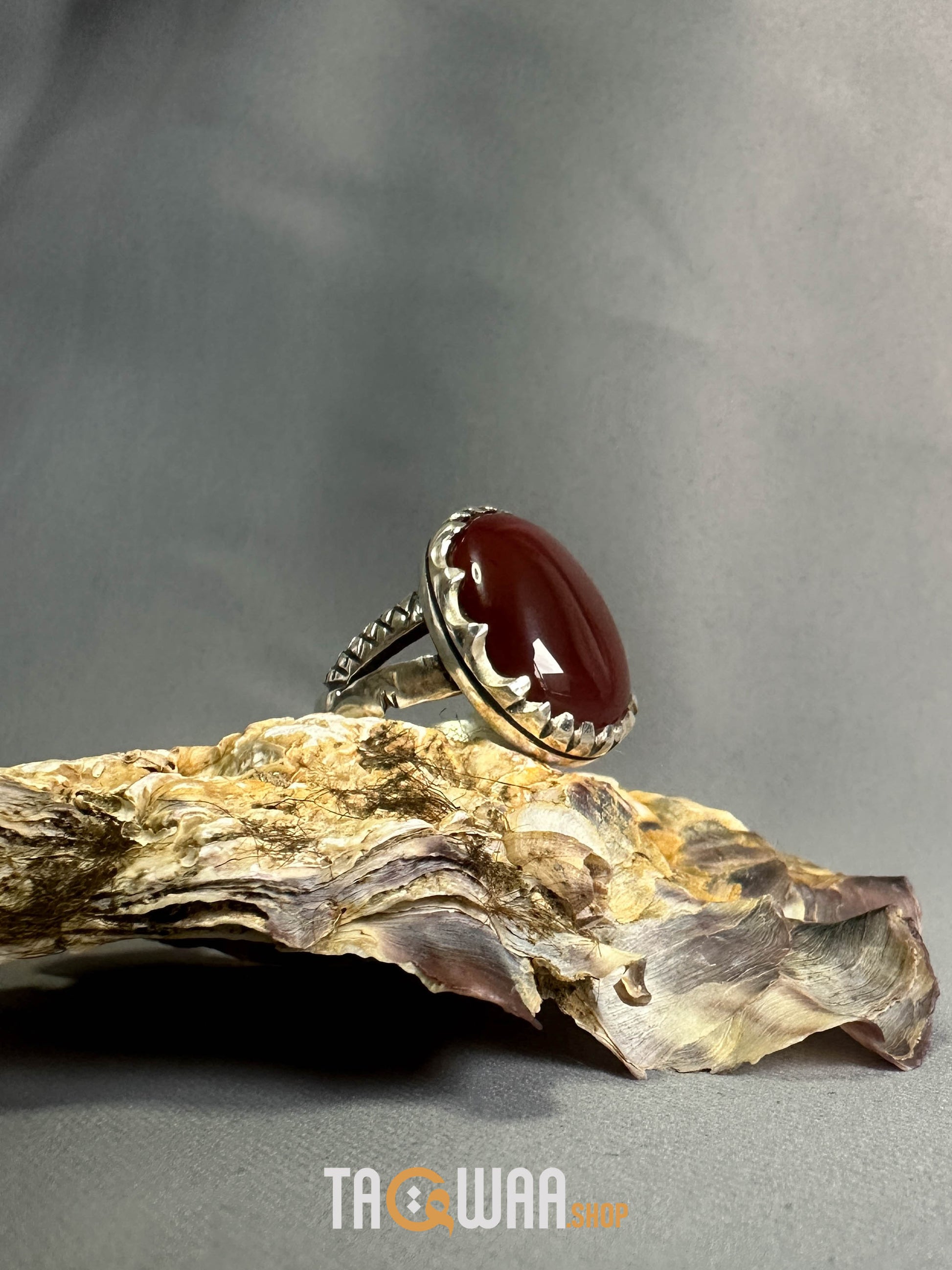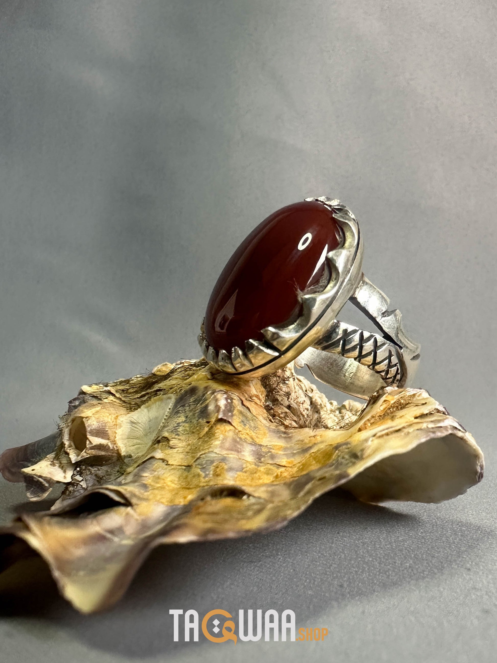 Elevate your style with our Red Yemeni Agate Aqeeq Oval Silver Ring. Handmade with 925 sterling silver and adorned with a red agate-aqeeq stone, its elegant design exudes timeless beauty. Express your individuality with this unique piece. Own a piece of art, crafted with care and precision for you.