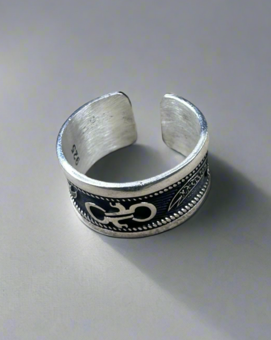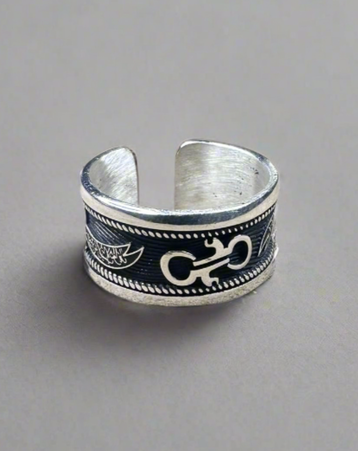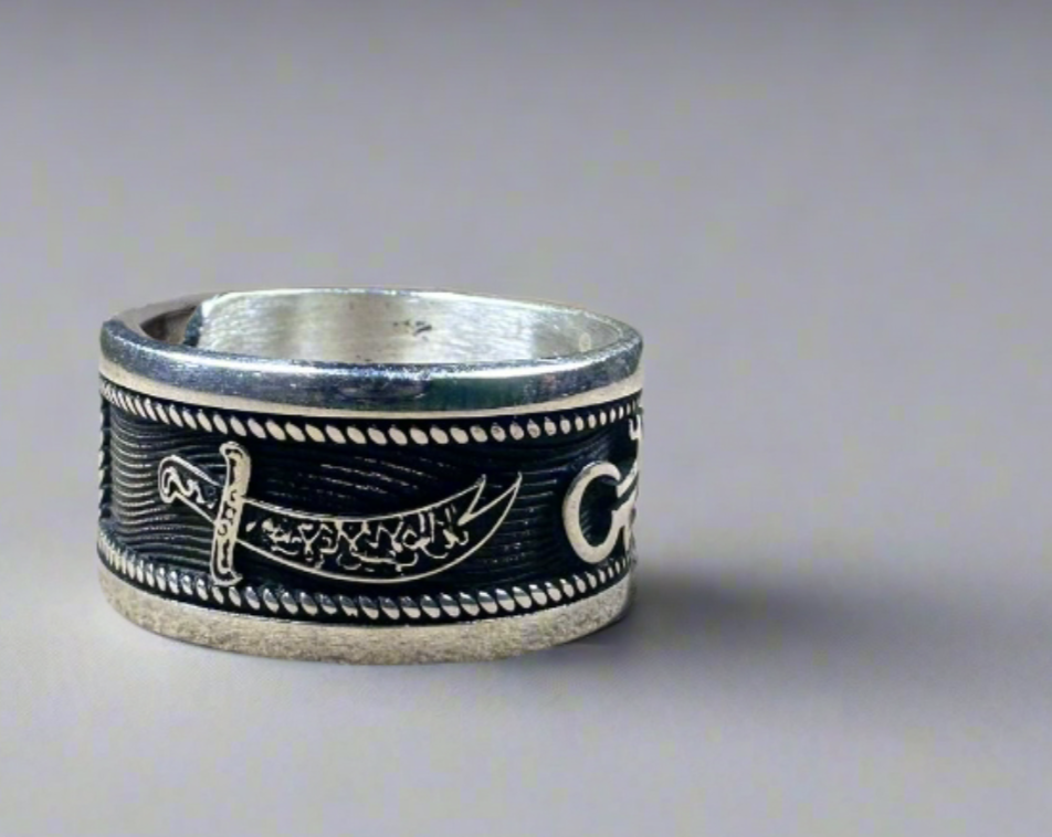This silver ring features the iconic Zulfiqar sword symbol, crafted with meticulous detail and high-quality materials. Available in a free size for a comfortable fit, this piece exudes both elegance and historical significance, making it a standout addition to any jewellery collection.