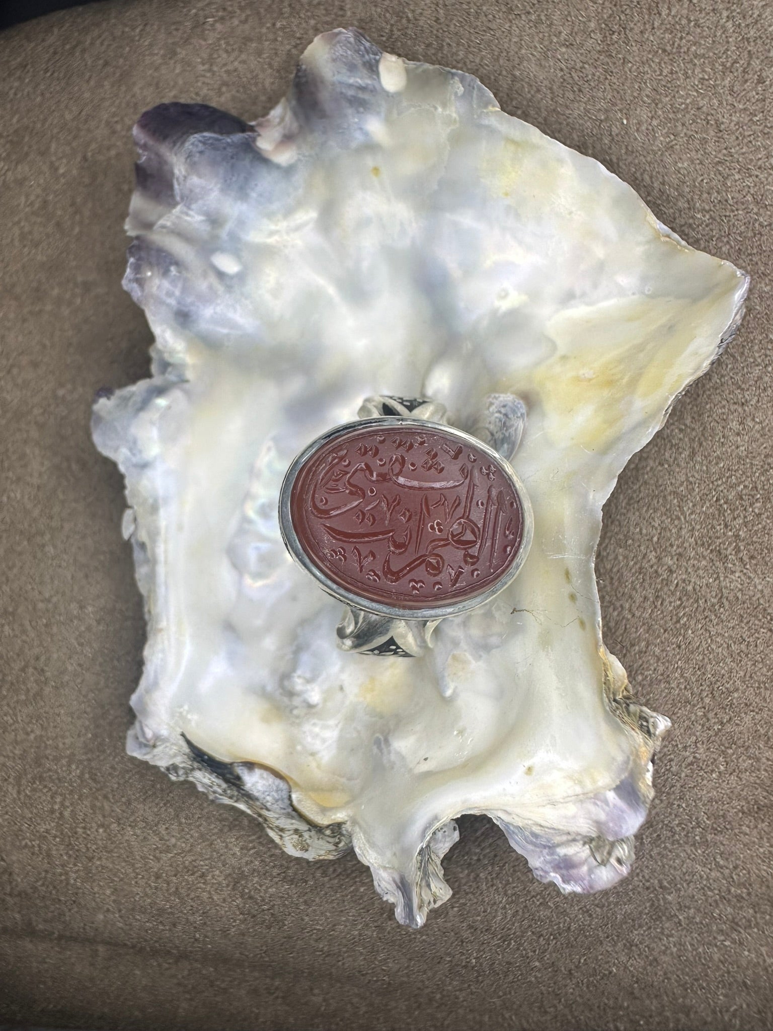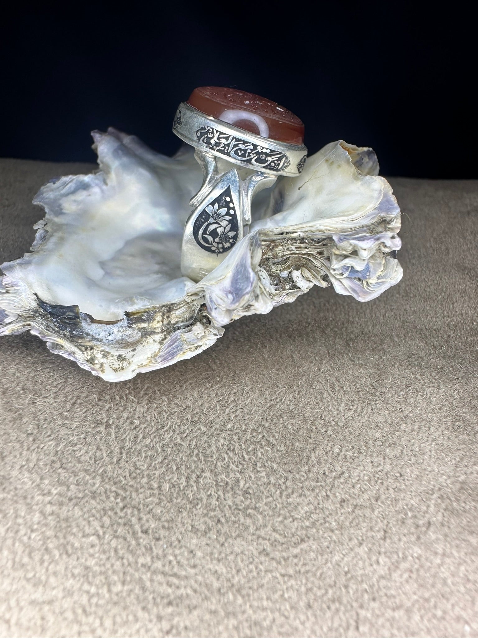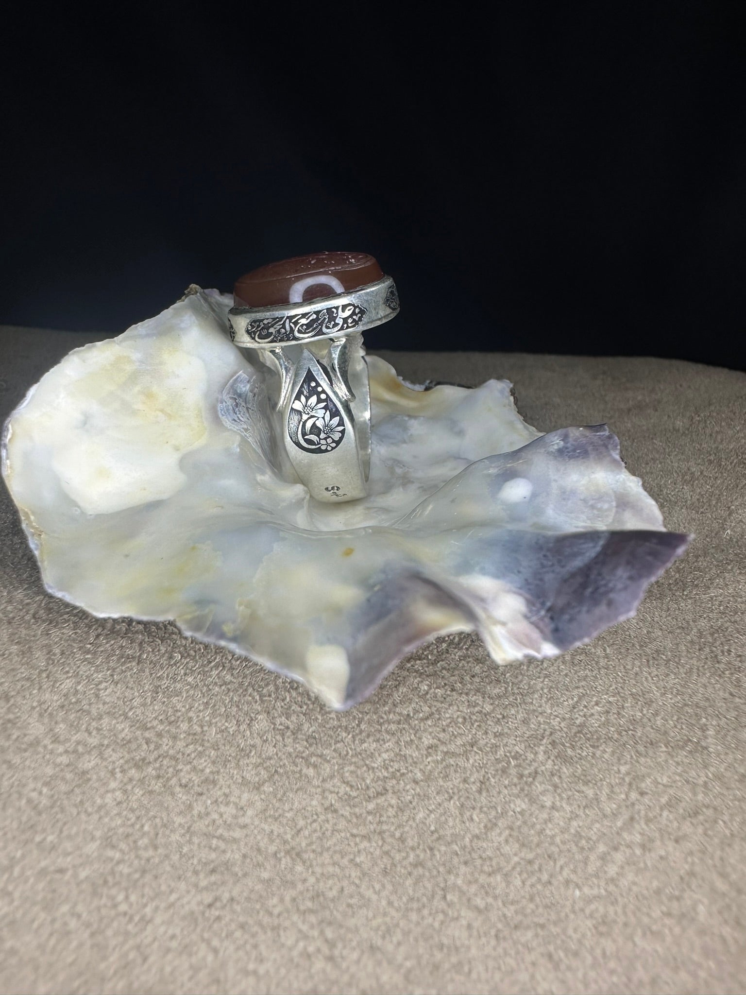 Elevate your style with our exquisite Yemeni BROWN Aqeeq ring, meticulously crafted from 925K sterling silver. Featuring a rich brown aqeeq and expert craftsmanship, it exudes luxury and sophistication, making it a statement piece for any occasion. Enhancing its allure is the inscription اللهم انت ثقتي (O Allah, You are my confidence).
