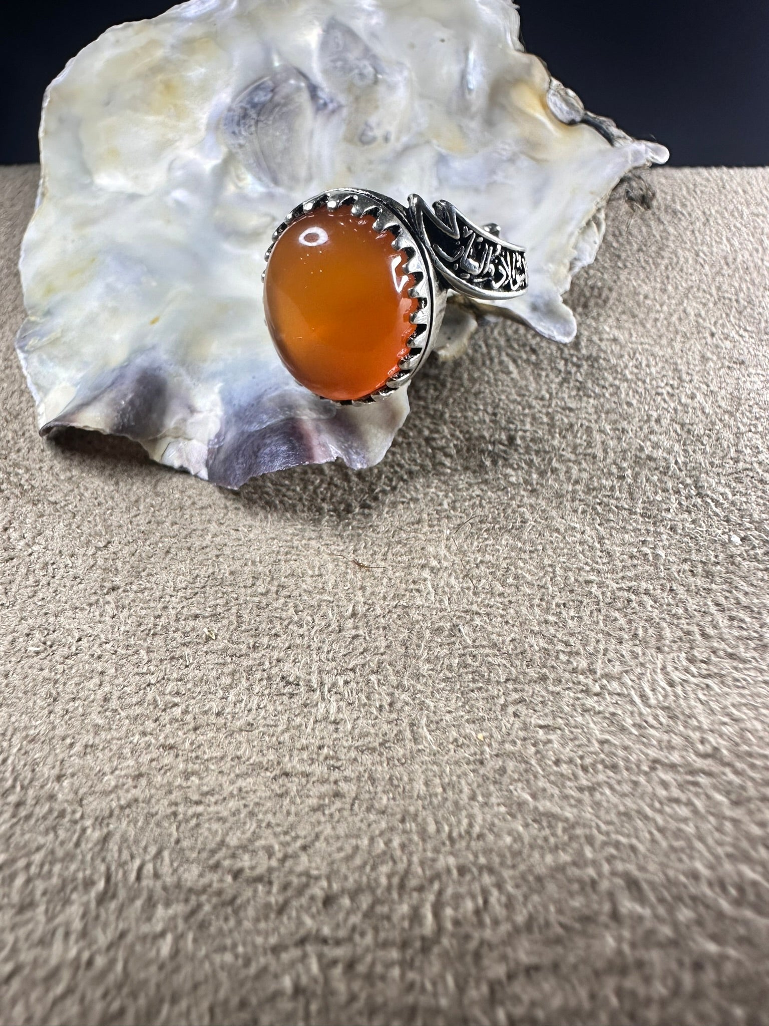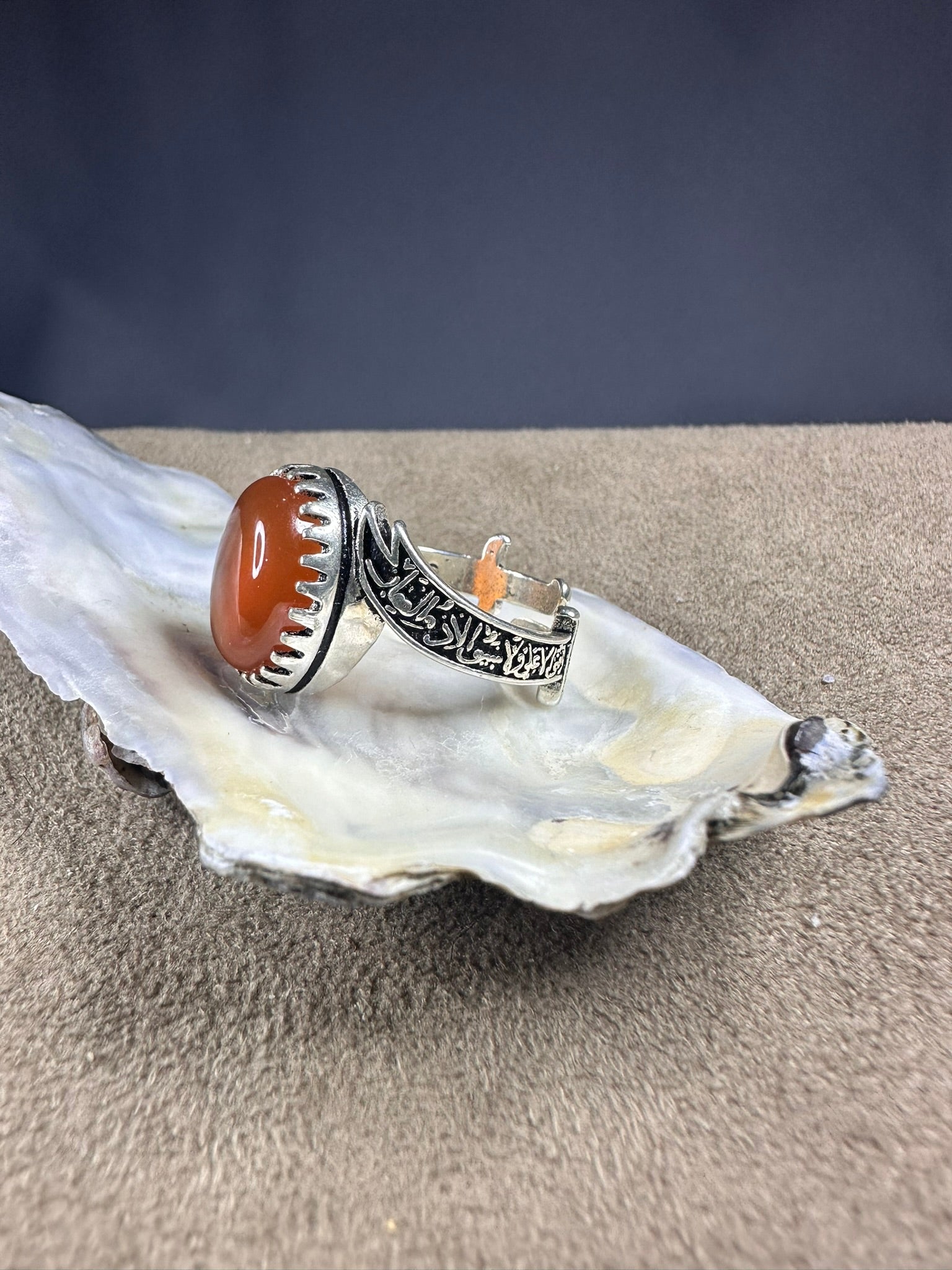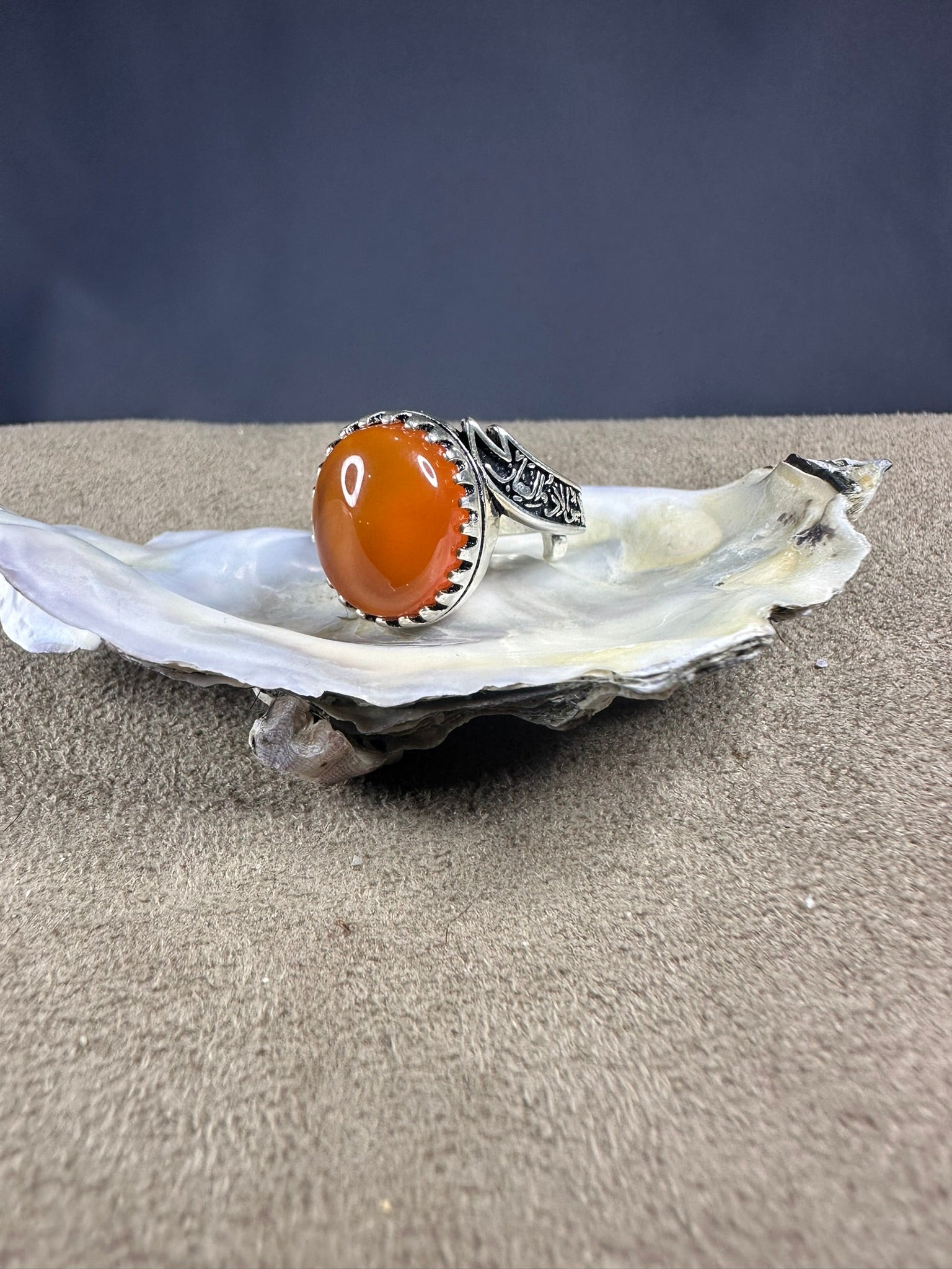Elevate your look with our stunning Yemeni ORANGE Aqeeq ring. Meticulously crafted with 925K sterling silver, this FREE SIZE ring boasts exceptional quality and a timeless design. Enhance your style and showcase your impeccable taste with this expertly made piece.