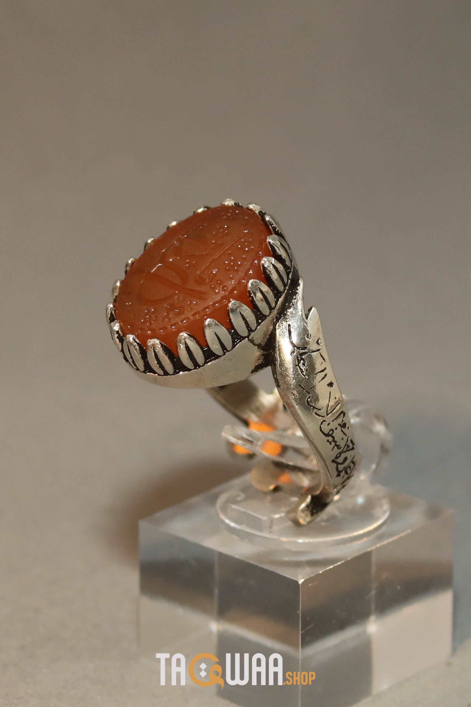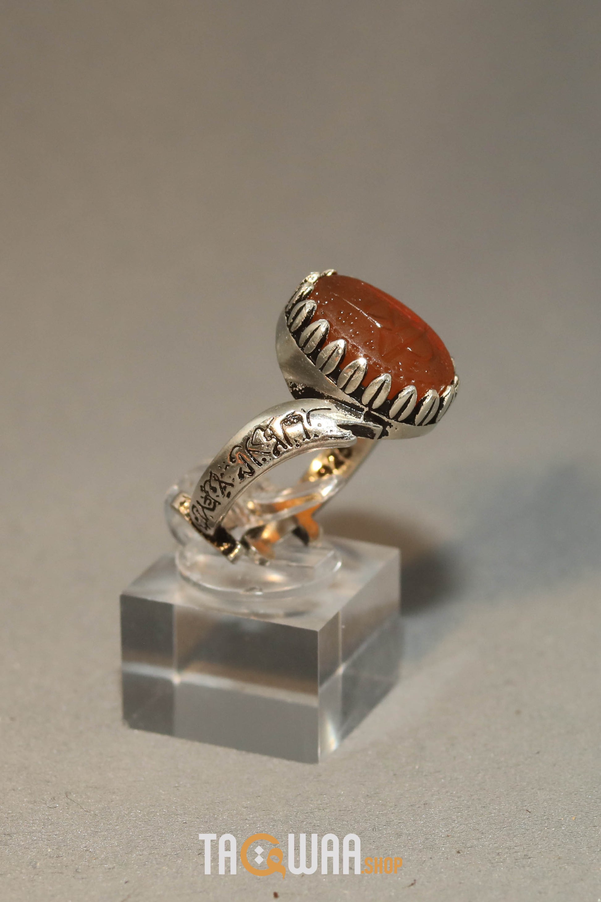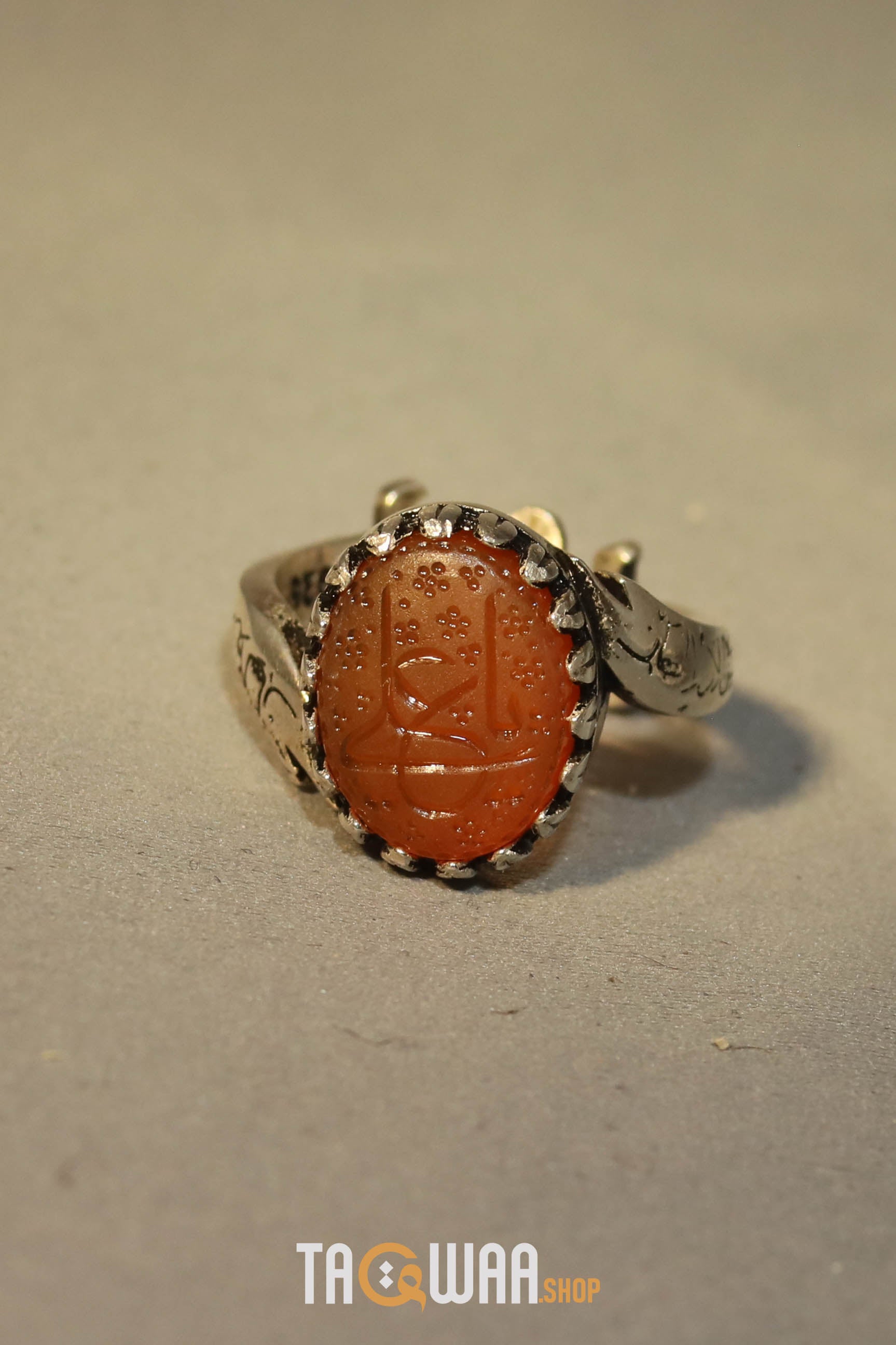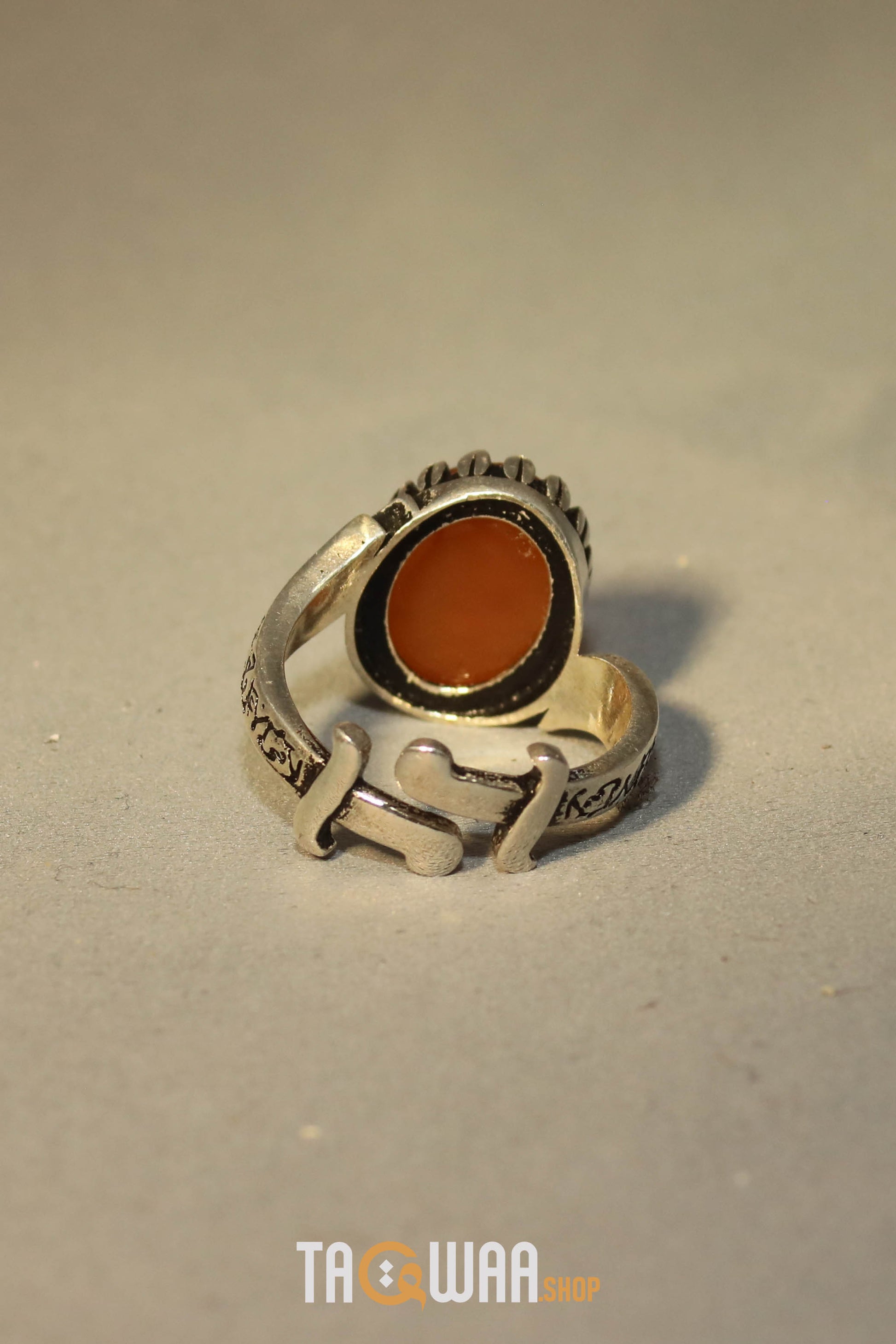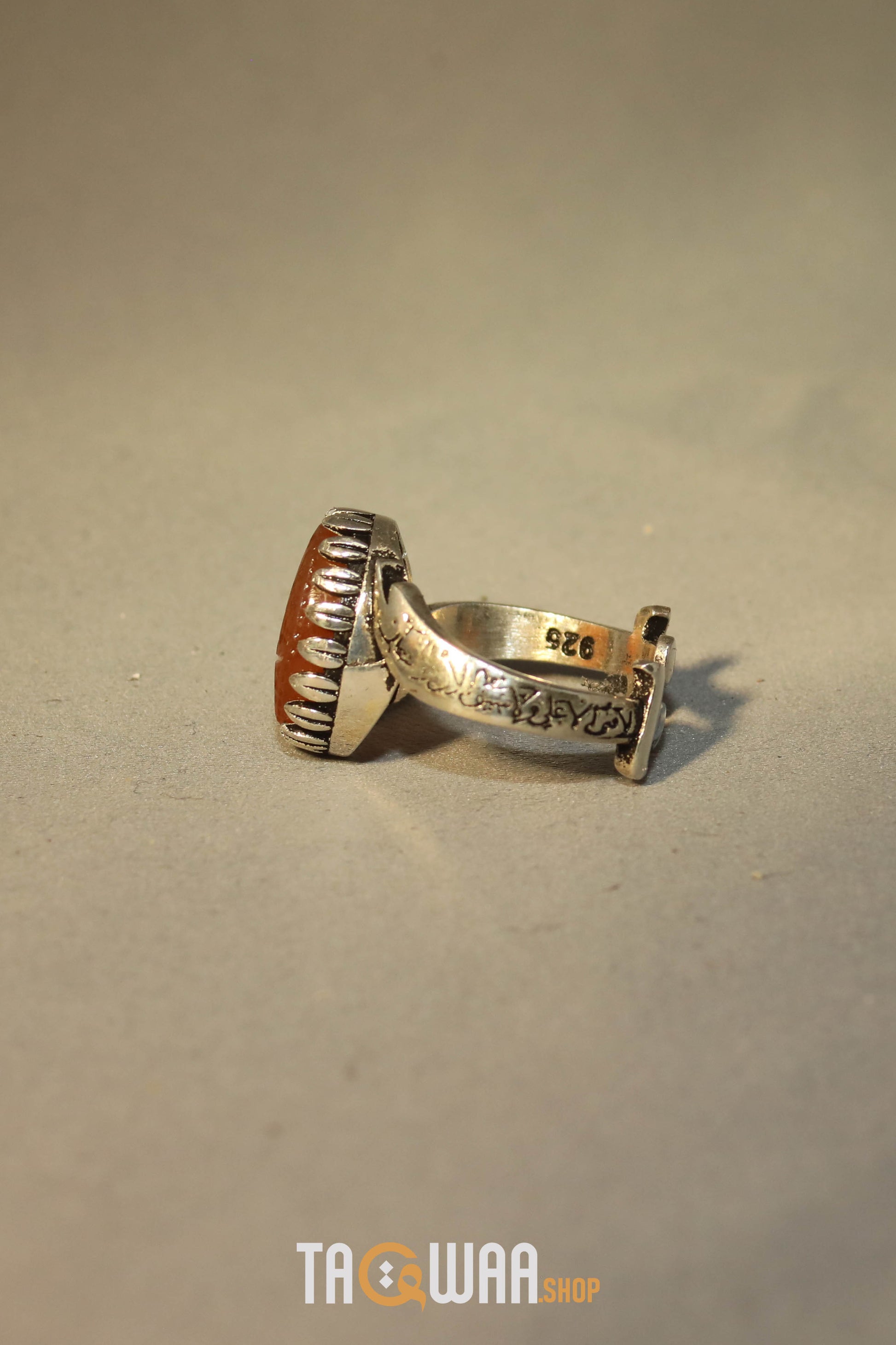 Elevate your style with our expertly crafted Yemeni Orange Aqeeq ring. Made with high-quality 925K sterling silver and featuring a unique and elegant design, this free-size ring can be adjusted to fit any finger. Perfect for men who appreciate fine craftsmanship. يا علي