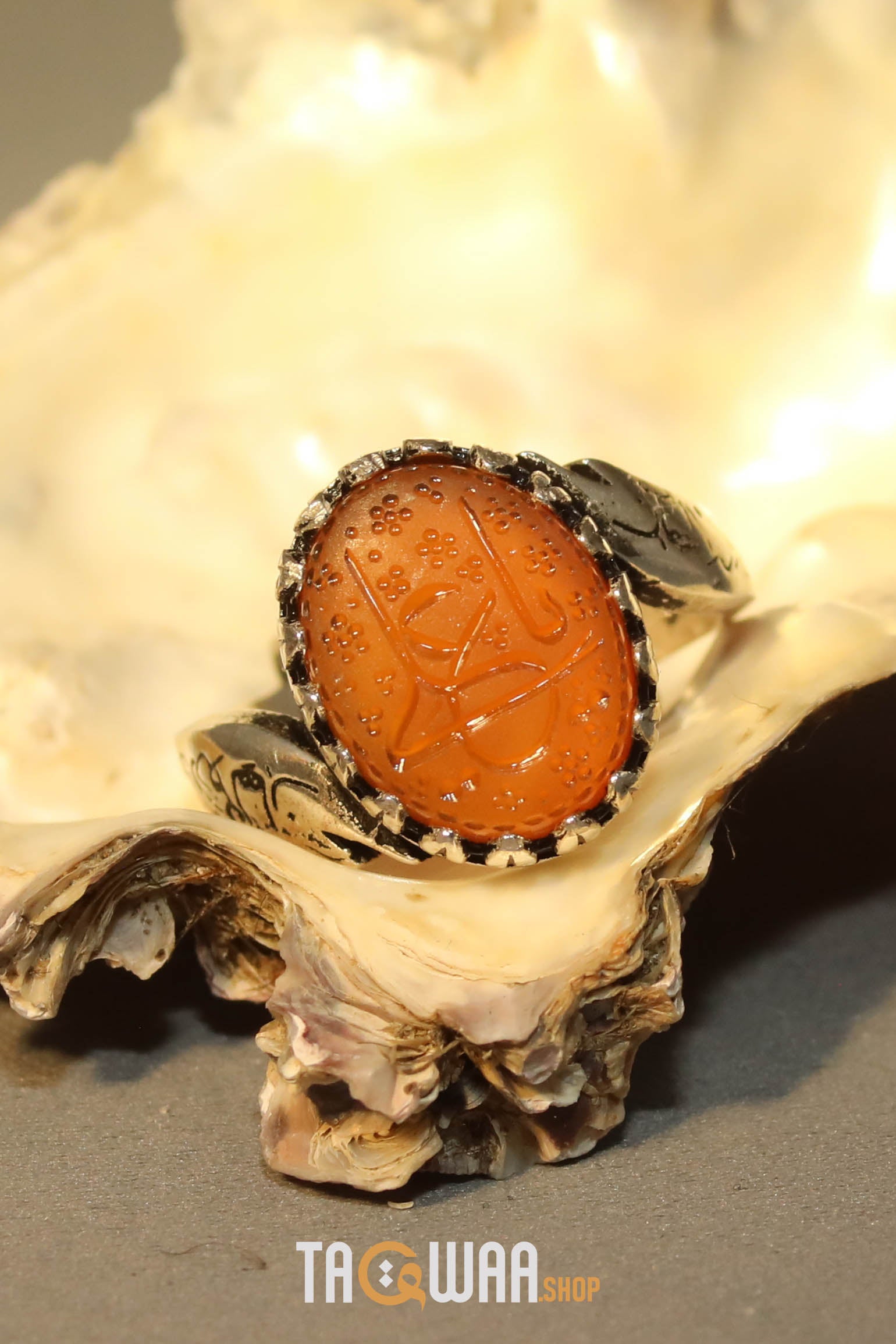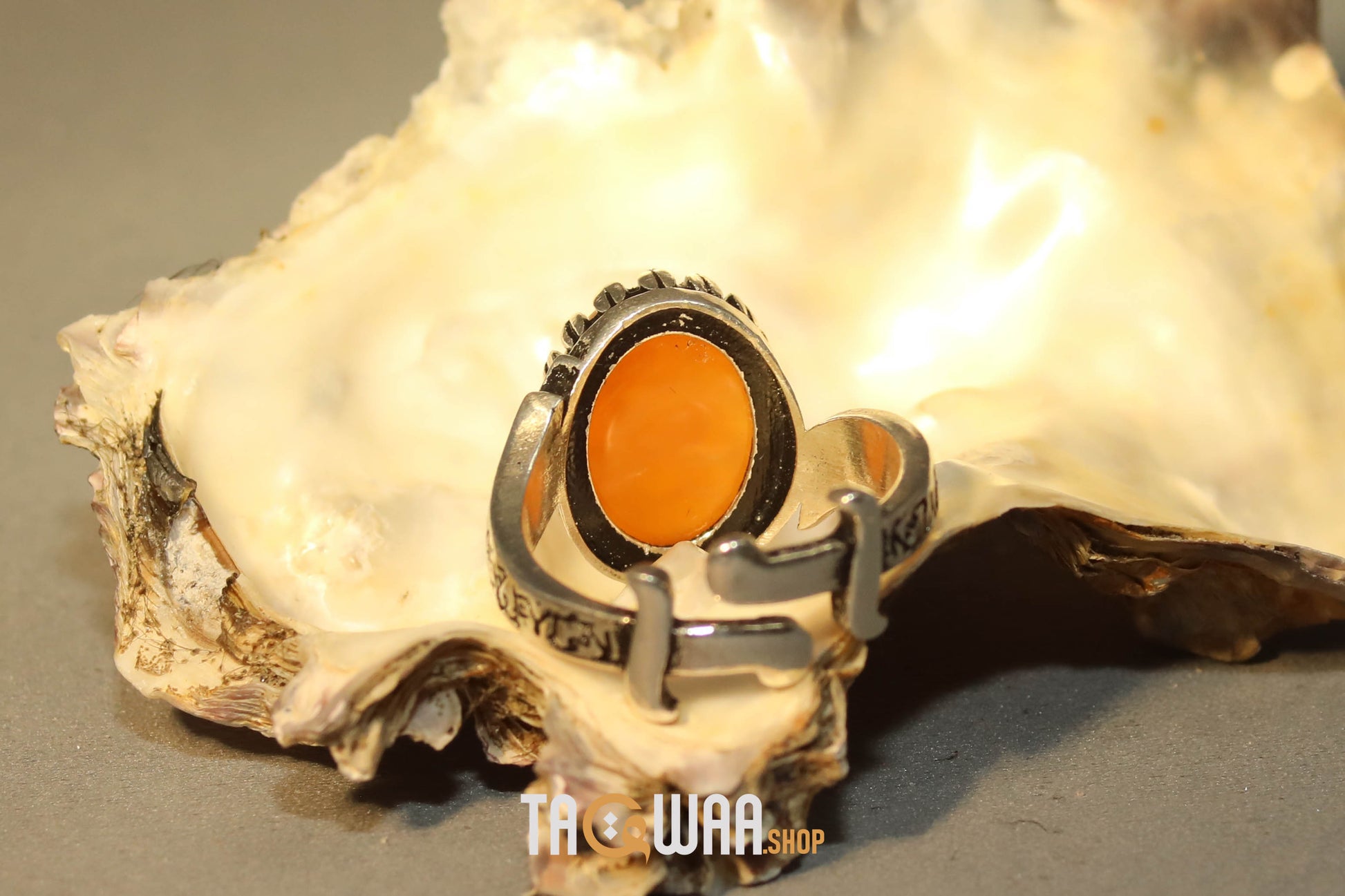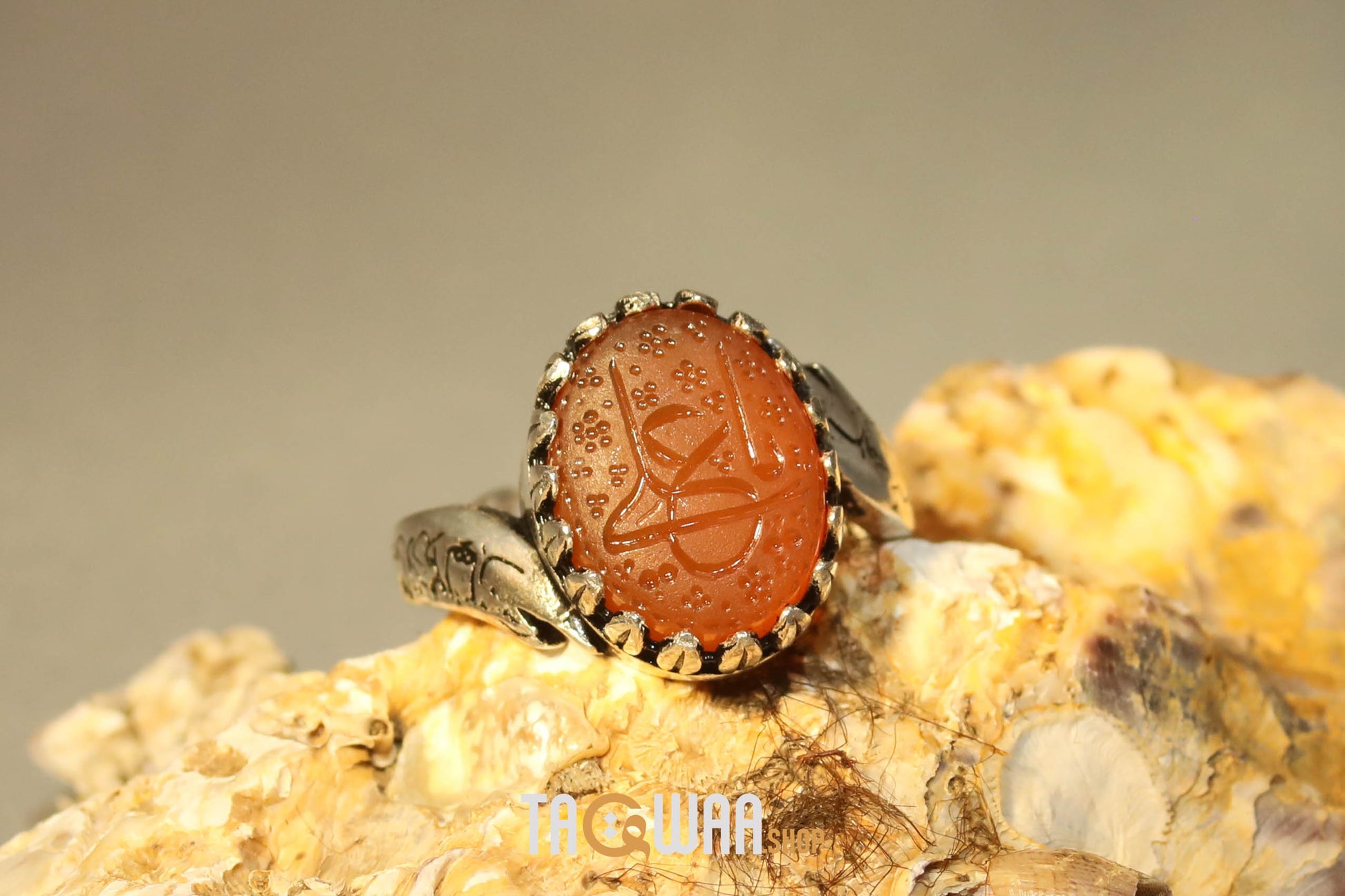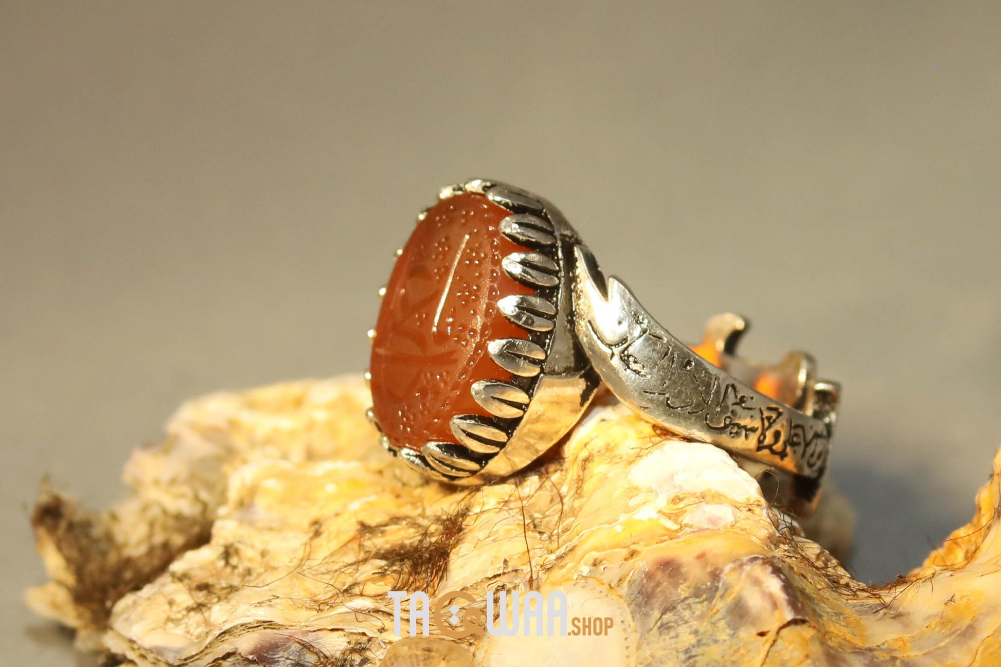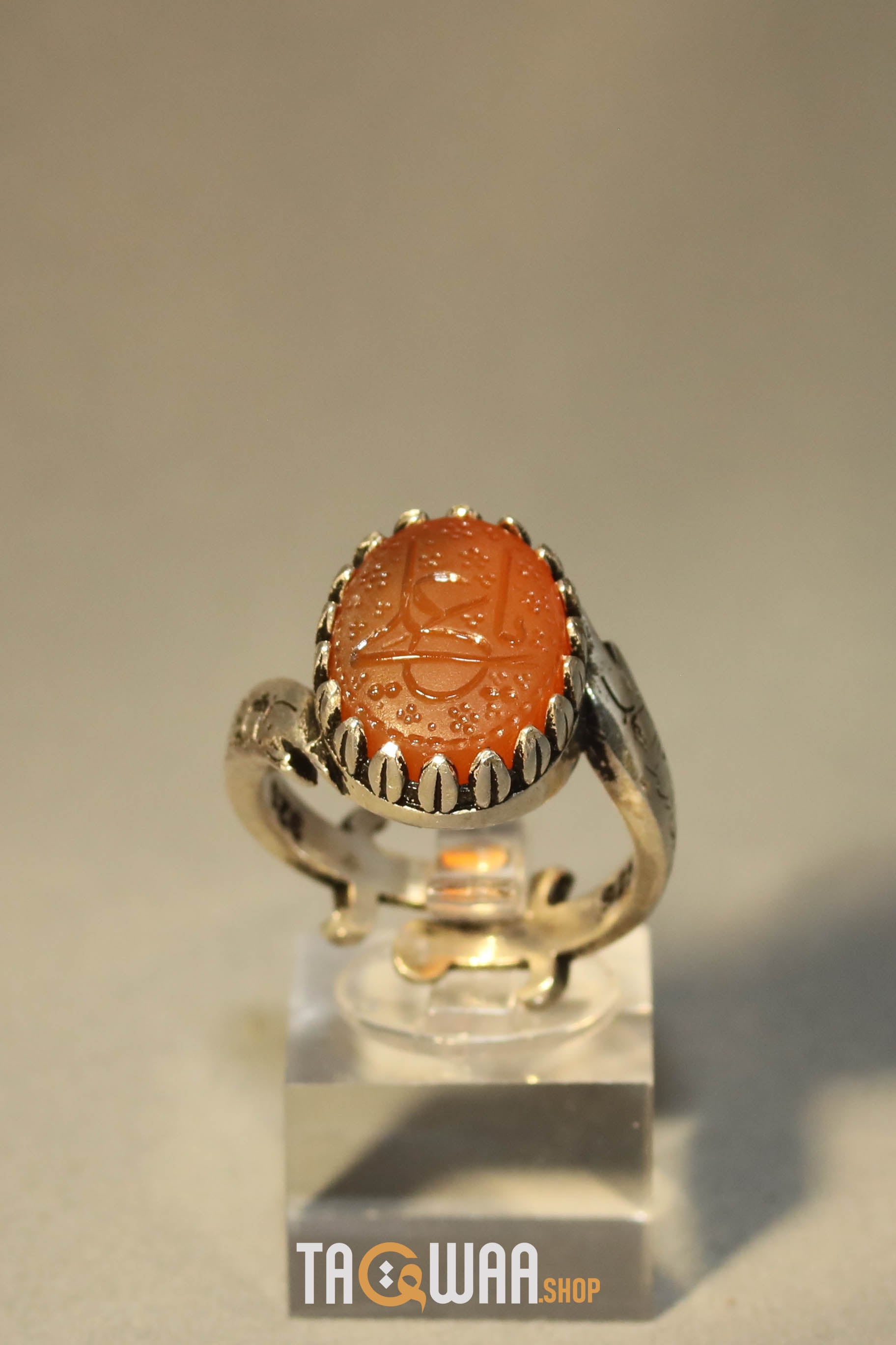 Elevate your style with our expertly crafted Yemeni Orange Aqeeq ring. Made with high-quality 925K sterling silver and featuring a unique and elegant design, this free-size ring can be adjusted to fit any finger. Perfect for men who appreciate fine craftsmanship. يا علي